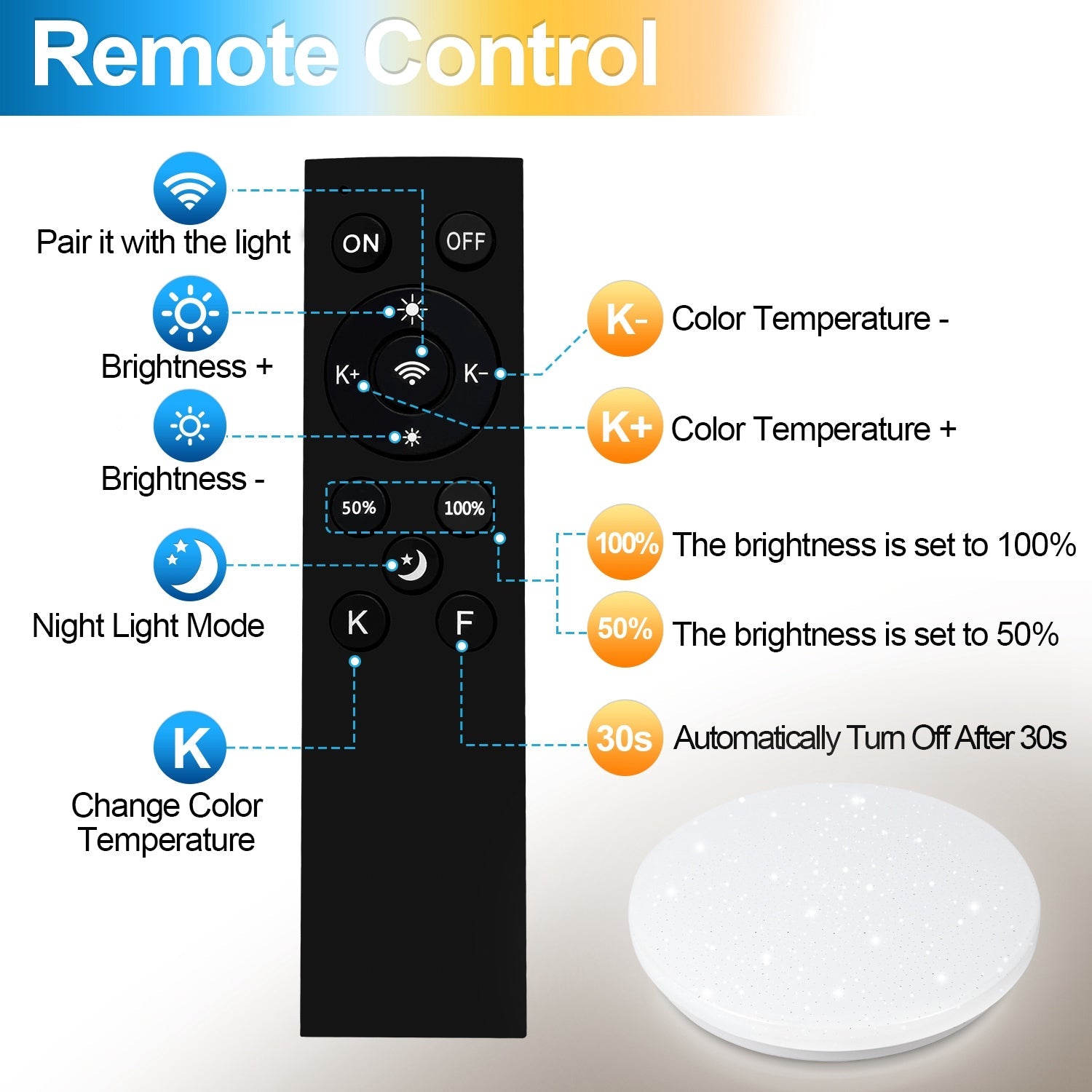 【Nachtlichtfunktion und 30-zweite-Timing-Funktion】Durch die Nachtlichtfunktion kann die Deckenlampe sogar die ganze Nacht leuchten.Sie können die Lampe 30s später so einstellen, dass sie sich selbst ausschaltet, sodass Personen, die zum Schlafen Licht benötigen, das Licht nicht die ganze Nacht eingeschaltet lassen müssen, was viel Energie spart.