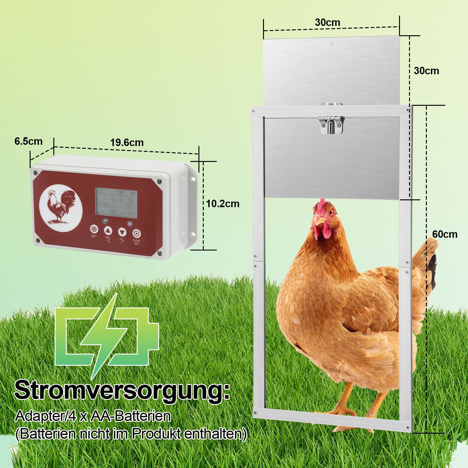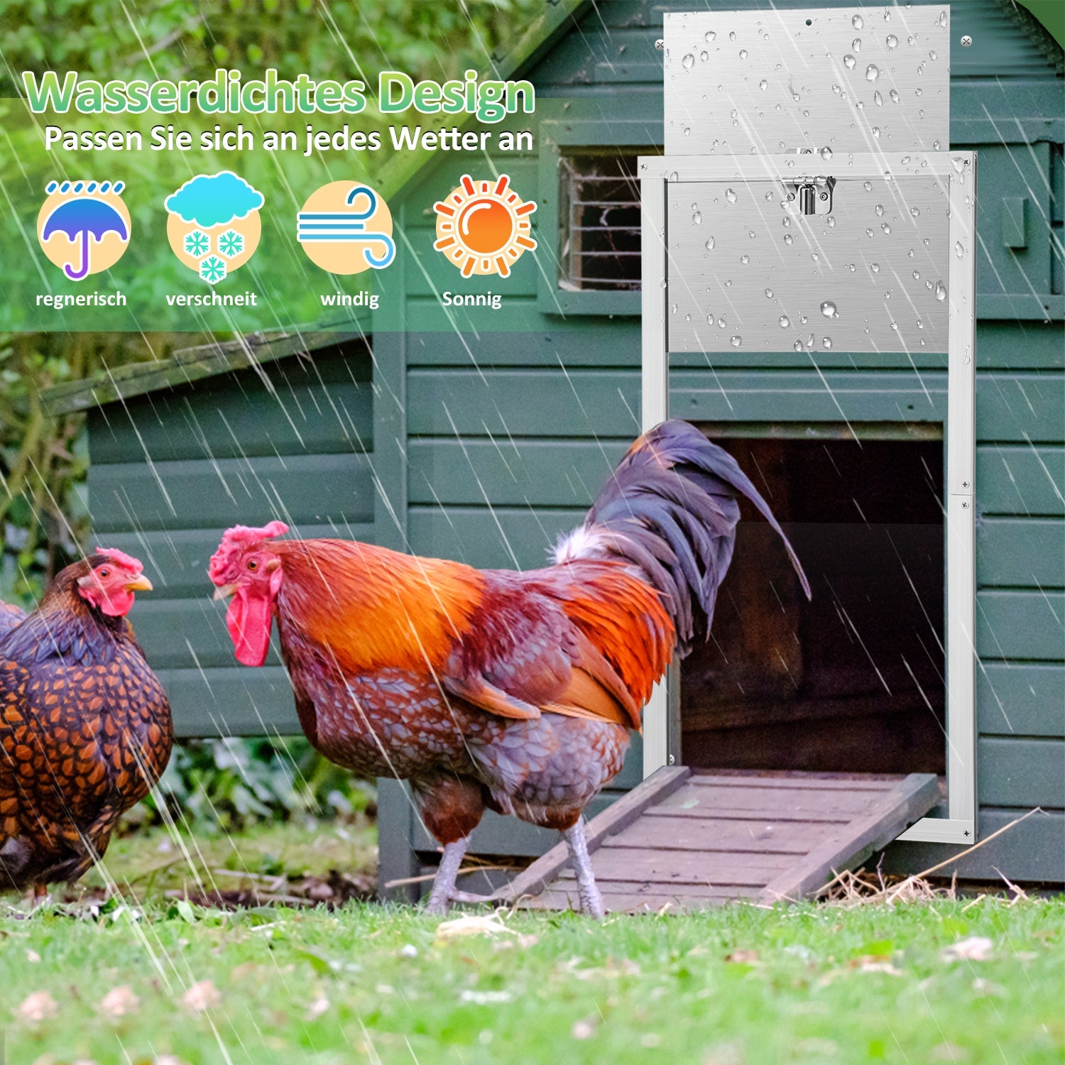 【Hochwertige Hühnerklappe】Die elektrische hühnerklappe besteht aus ABS und Aluminium, Sicher und zuverlässig, IP44 wasserdicht, Beständig gegen Hitze und Kälte. Unsere Hühnerklappe zeichnet sich durch eine herausragende Qualität aus, die Ihnen eine langfristige und zuverlässige Nutzung gewährleistet.