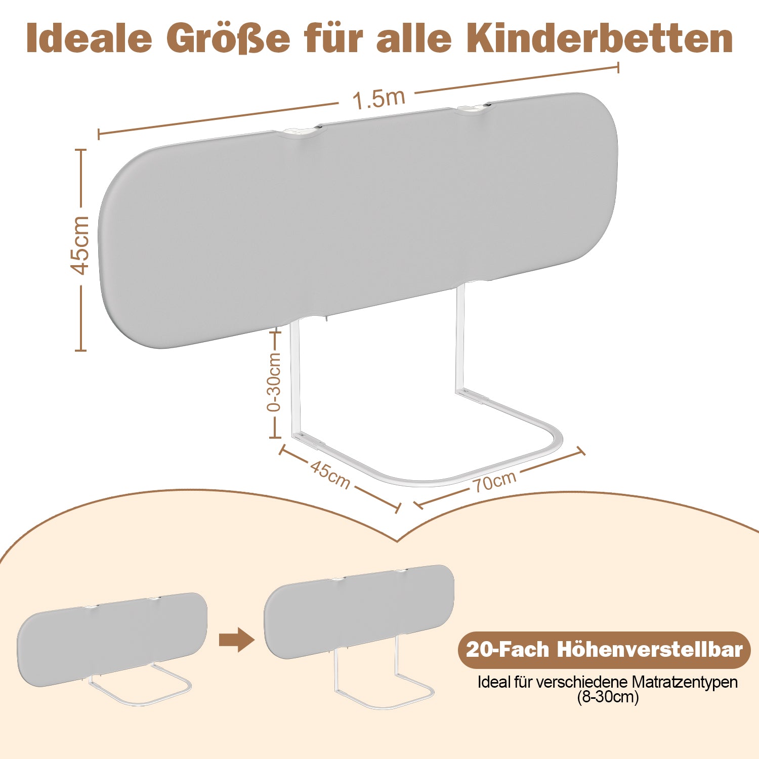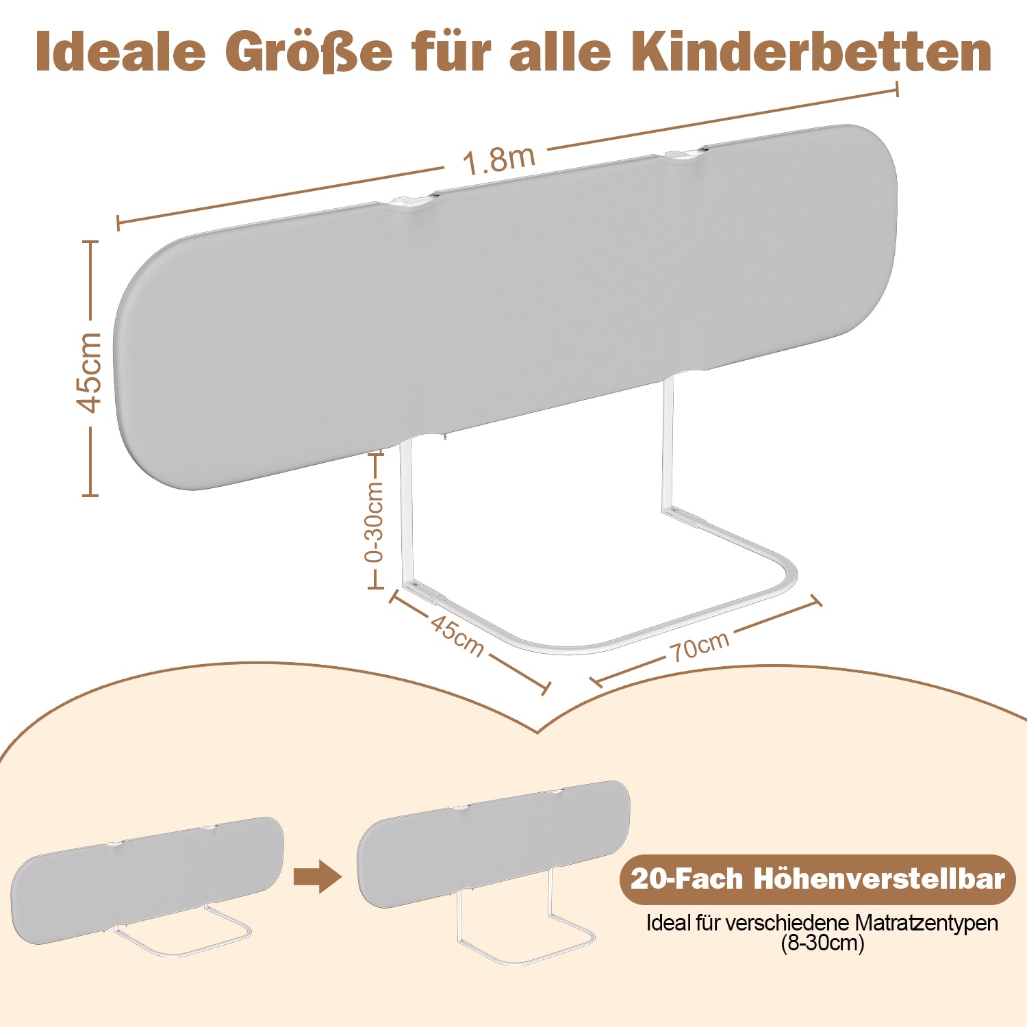 Höhenverstellbar: Die Kinderbettgitter bieten 20 einstellbare Höhenpositionen und sind für Matratzen mit einer Dicke von 8 bis 30 cm geeignet. So passt es sich optimal den unterschiedlichsten Betthöhen an.