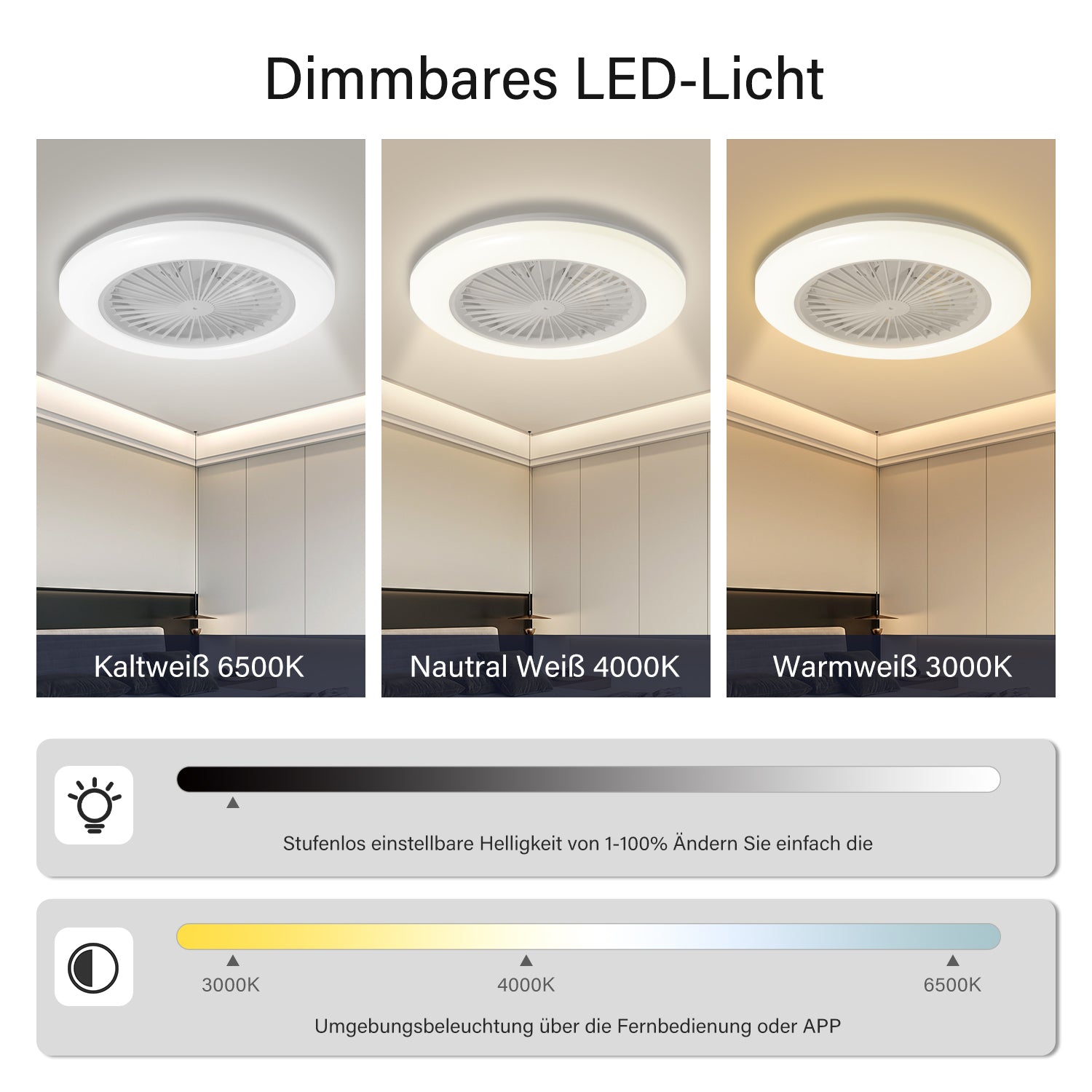 Einstellbare Windgeschwindigkeit: Sechs Windgeschwindigkeiten, bequem einstellbar per Fernbedienung oder Bluetooth-App. Perfekt für kühle Brisen im Sommer oder milde Luftzirkulation im Winter.