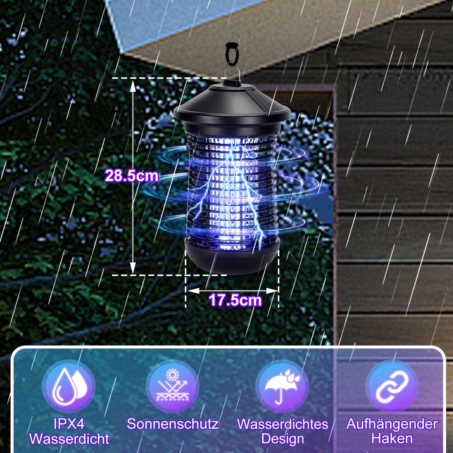 Verwenden Sie den Elektrisch Mückenlampe in Innenräumen, entweder in hängendem Zustand oder auf einem Tisch oder einer anderen stabilen Oberfläche, um alle fliegenden Schädlinge in Ihrem Haus anzuziehen und abzutöten.