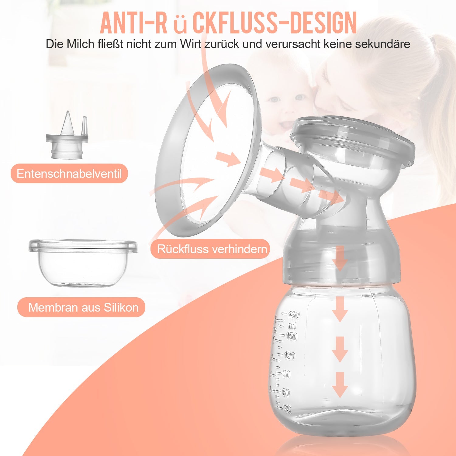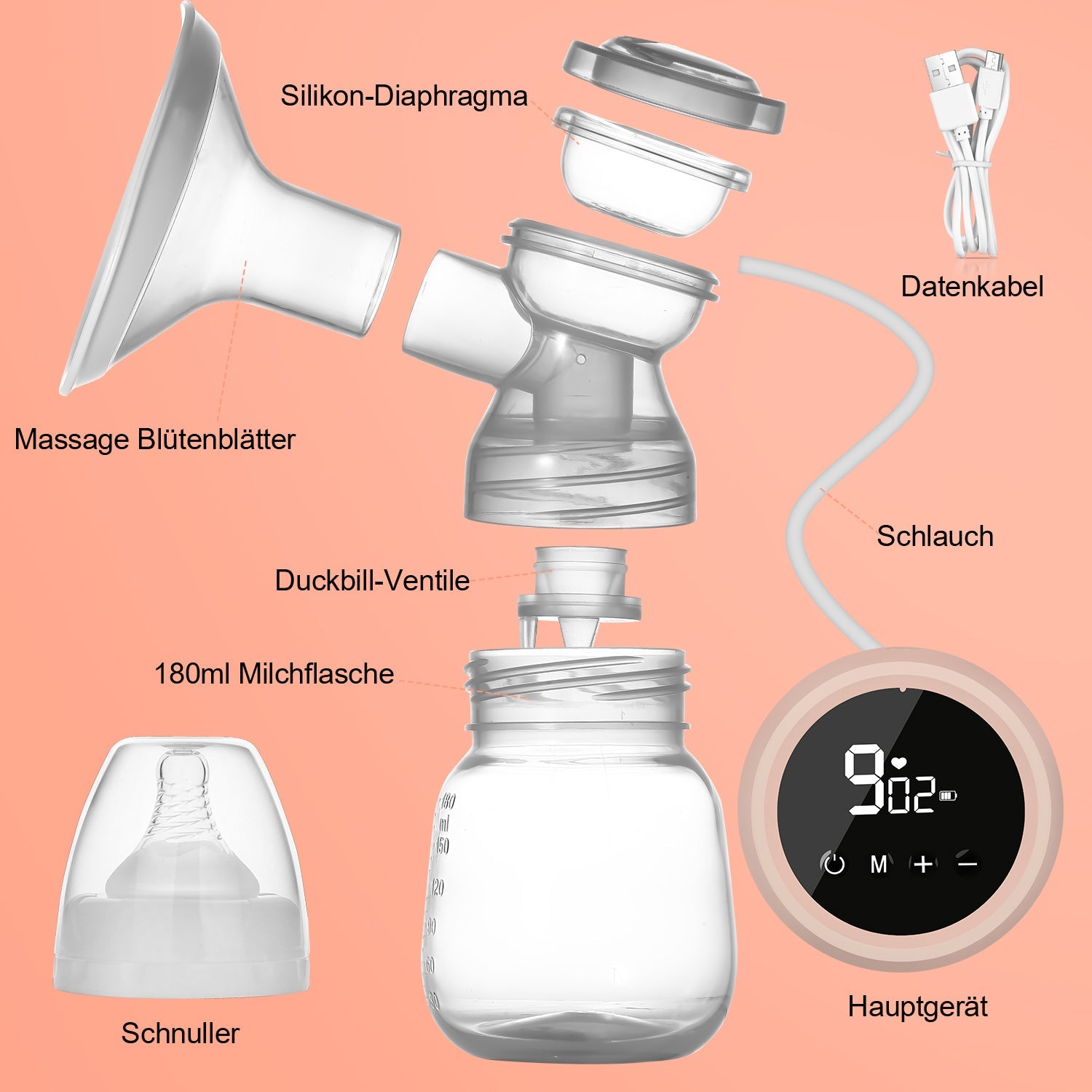 [Rückflussverhinderndes Design] Geschlossene Umgebung trennt Luft und Muttermilch voneinander, so dass keine Kontamination durch Bakterien, Schimmel oder Viren möglich ist. Alle Teile außer elektrischen Komponenten sind abnehmbar und können gereinigt und desinfiziert werden. Kann in der Spülmaschine gereinigt werden.