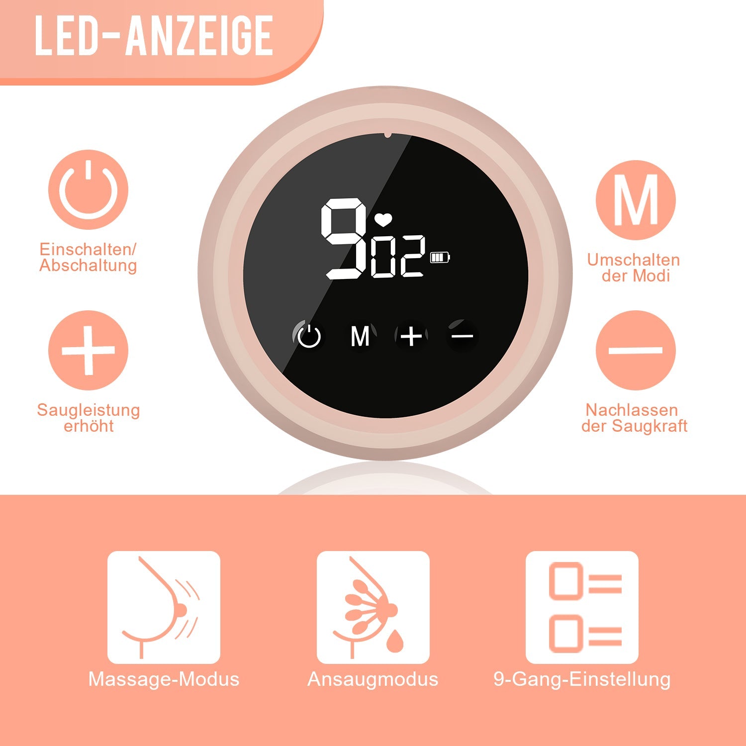 [2 Modi und 9 Saugstufen] Massage-Modus und Milchpumpen-Modus. Modi und Saugstärke können frei angepasst werden, damit Mütter schmerzfrei Milch pumpen können. Das LED-Touch-Display zeigt deutlich den Modus, die Saugstärke, die Batterieleistung und die Zeit an. Mit der elektrischen Milchpumpe können Sie das Display auch nachts klar sehen.