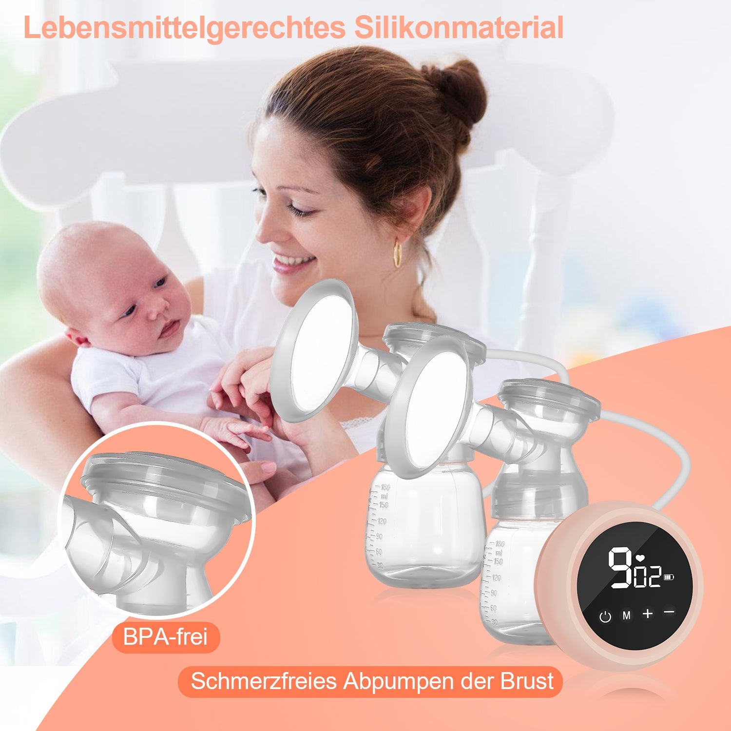 [Starke Saugkraft, geräuschlos] Einzel- oder Doppelseitenmodus kann frei umgeschaltet werden, um entweder auf beiden Seiten gleichzeitig zu pumpen oder während des Stillens eine Seite abzupumpen. Intelligentes Display hilft Ihnen, die Pumpzeit im Auge zu behalten.