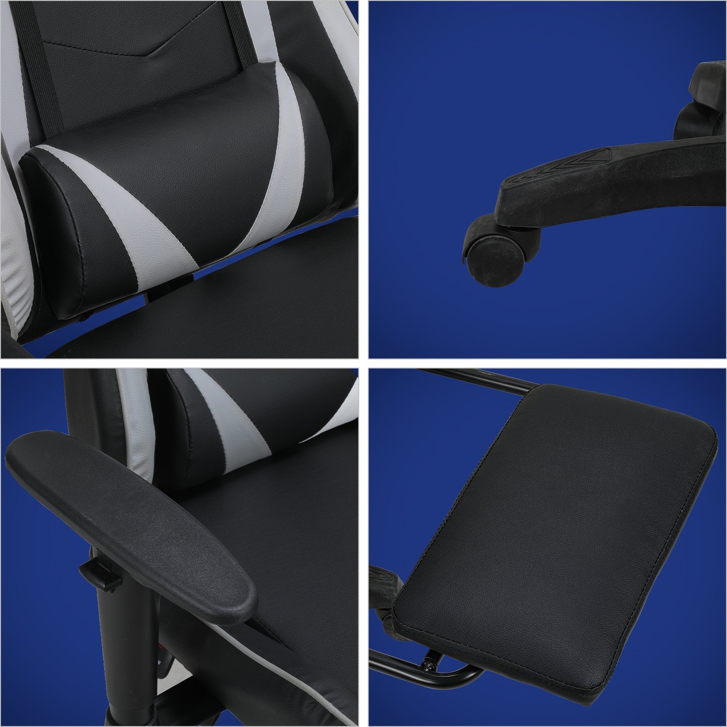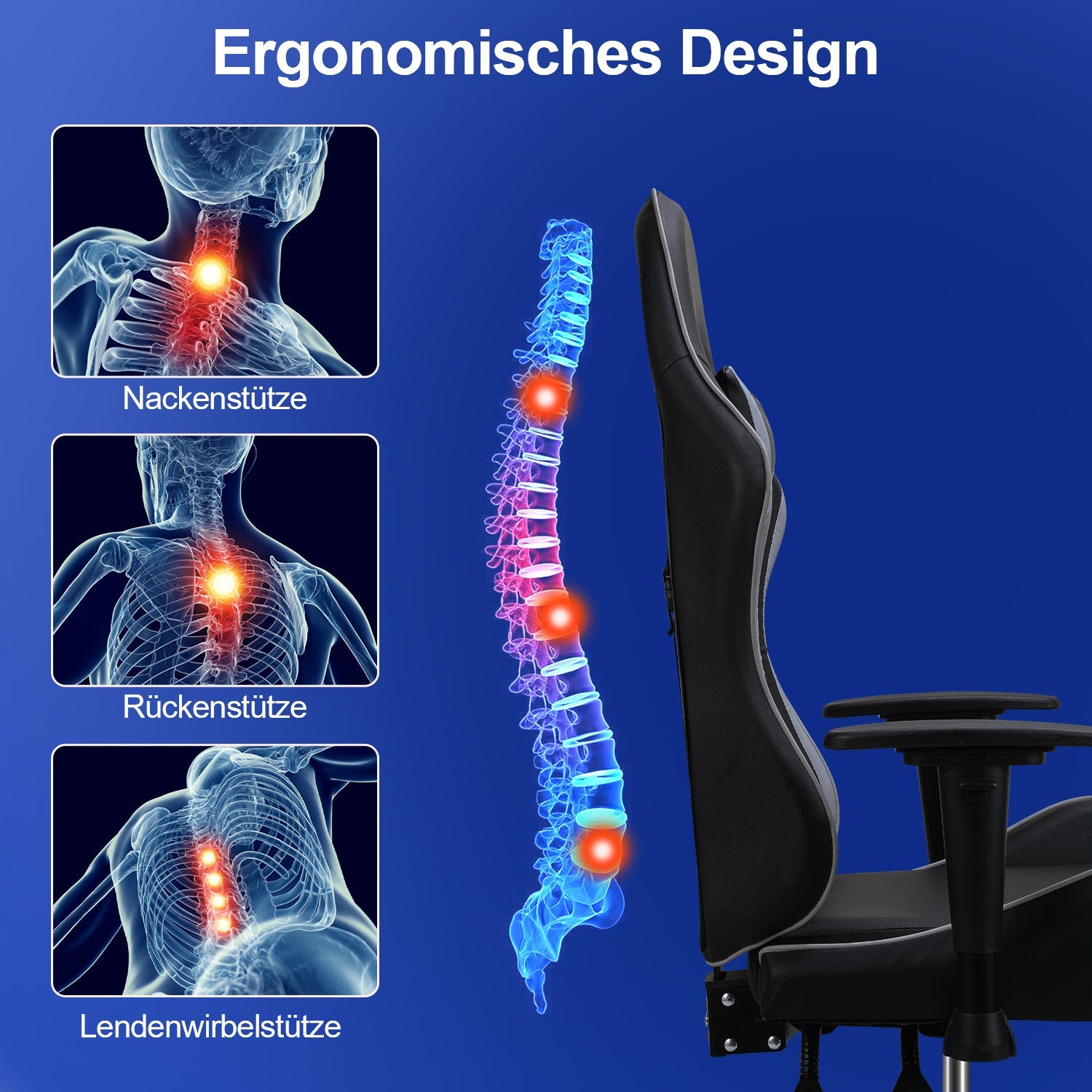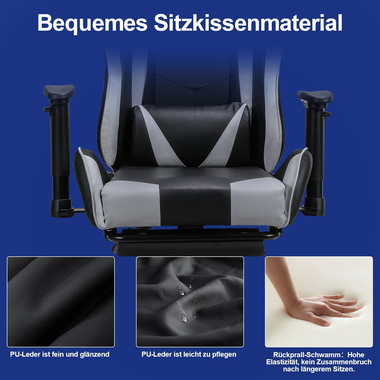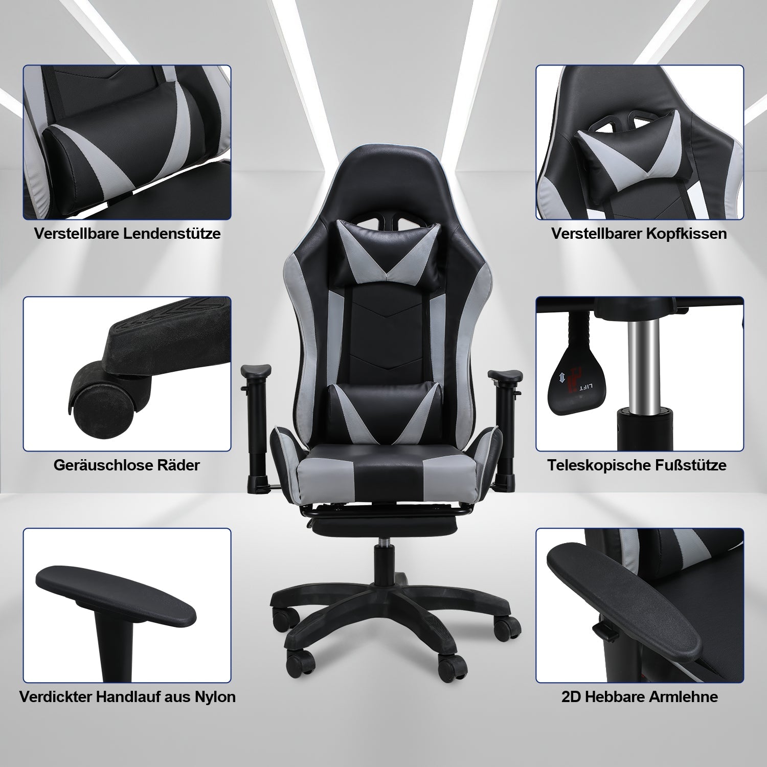 Komfortable Benutzererfahrung: Ausgestattet mit einem verstellbaren Lendenkissen, einem bequemen Kopfpolster, ausziehbarer Fußstütze und geräuschlosen Rollen, garantiert dieser ergonomische Computerstuhl den höchsten Komfort während langer Gaming- oder Arbeitsstunden.