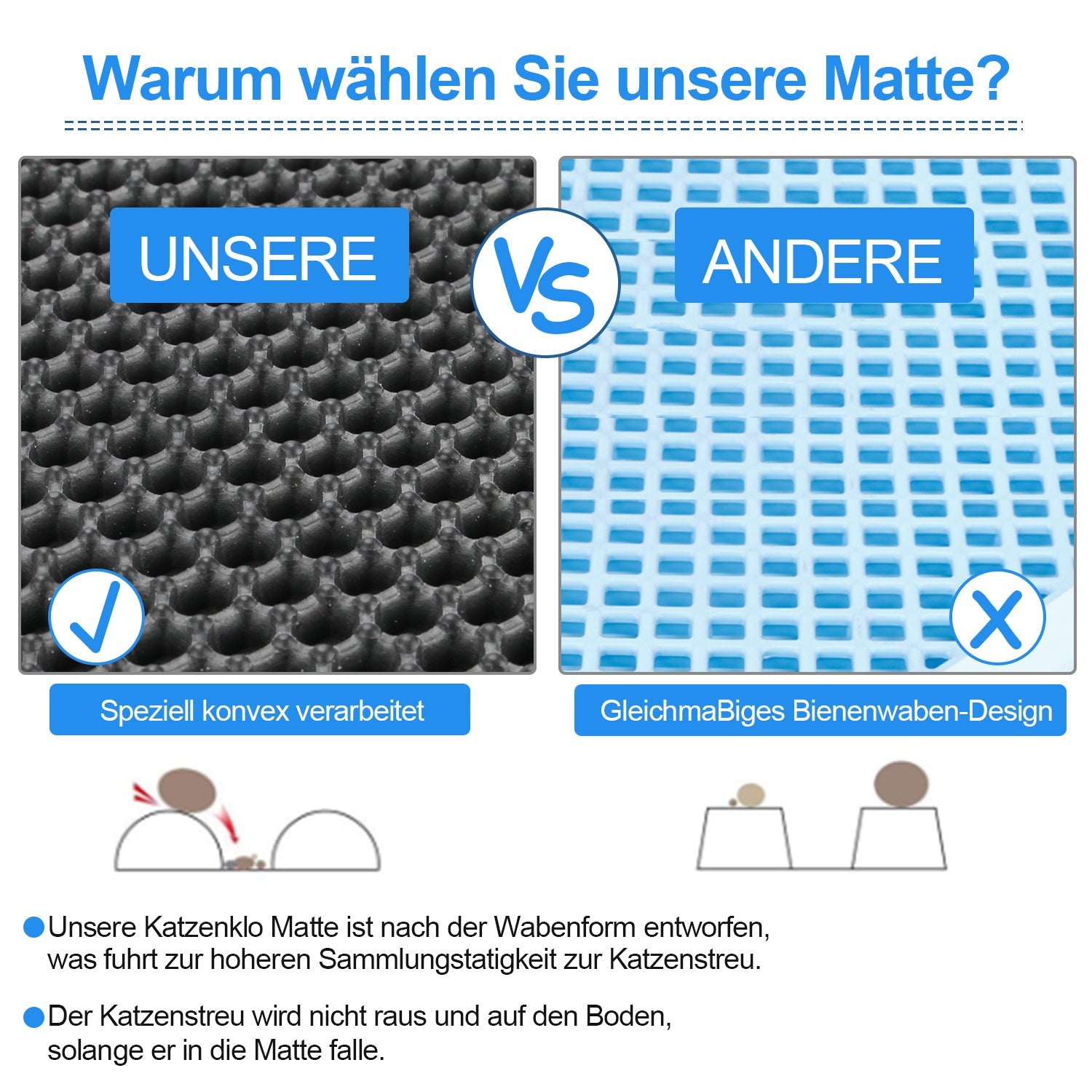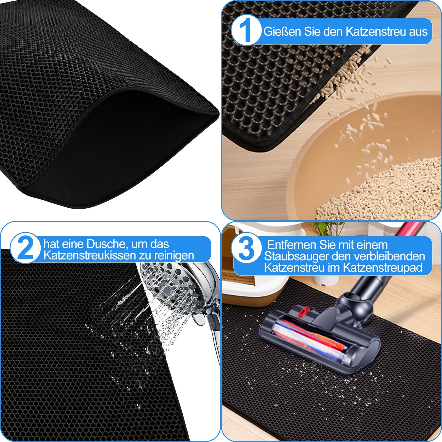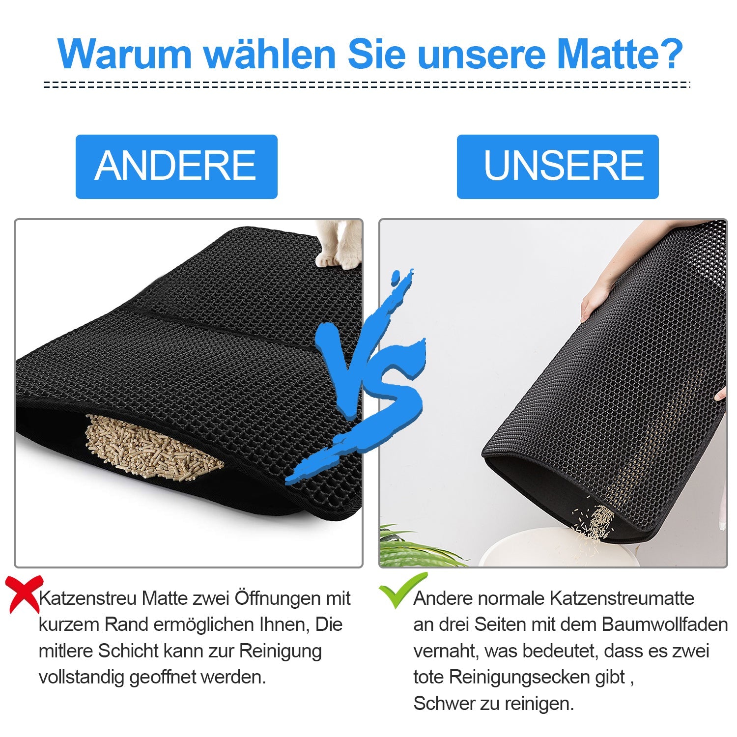🐈【Leicht zu reinigen】Durch die offene Kante auf beiden Seiten ist der versteckte kleine Abfall sichtbar und leicht zu reinigen.Sie können die Katzenstreu auf der Matte schnell reinigen, indem Sie das Katzenstreu Matte schütteln und mit Wasser abspülen.
