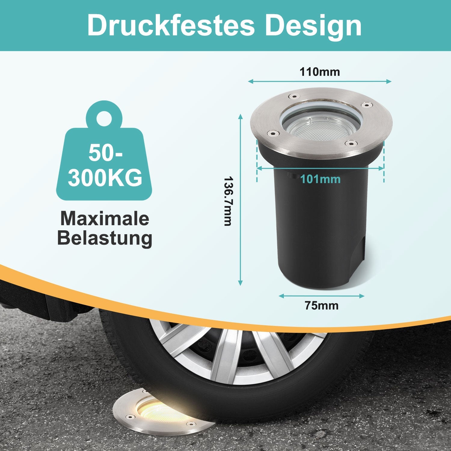 Belastbar bis zu 300kg: Dieser robuste Bodenleuchten kann bis zu 300kg tragen und ist damit ideal für Gehwege, Einfahrten oder Gartenbeleuchtung geeignet. Die langlebige Konstruktion gewährleistet eine zuverlässige Nutzung.