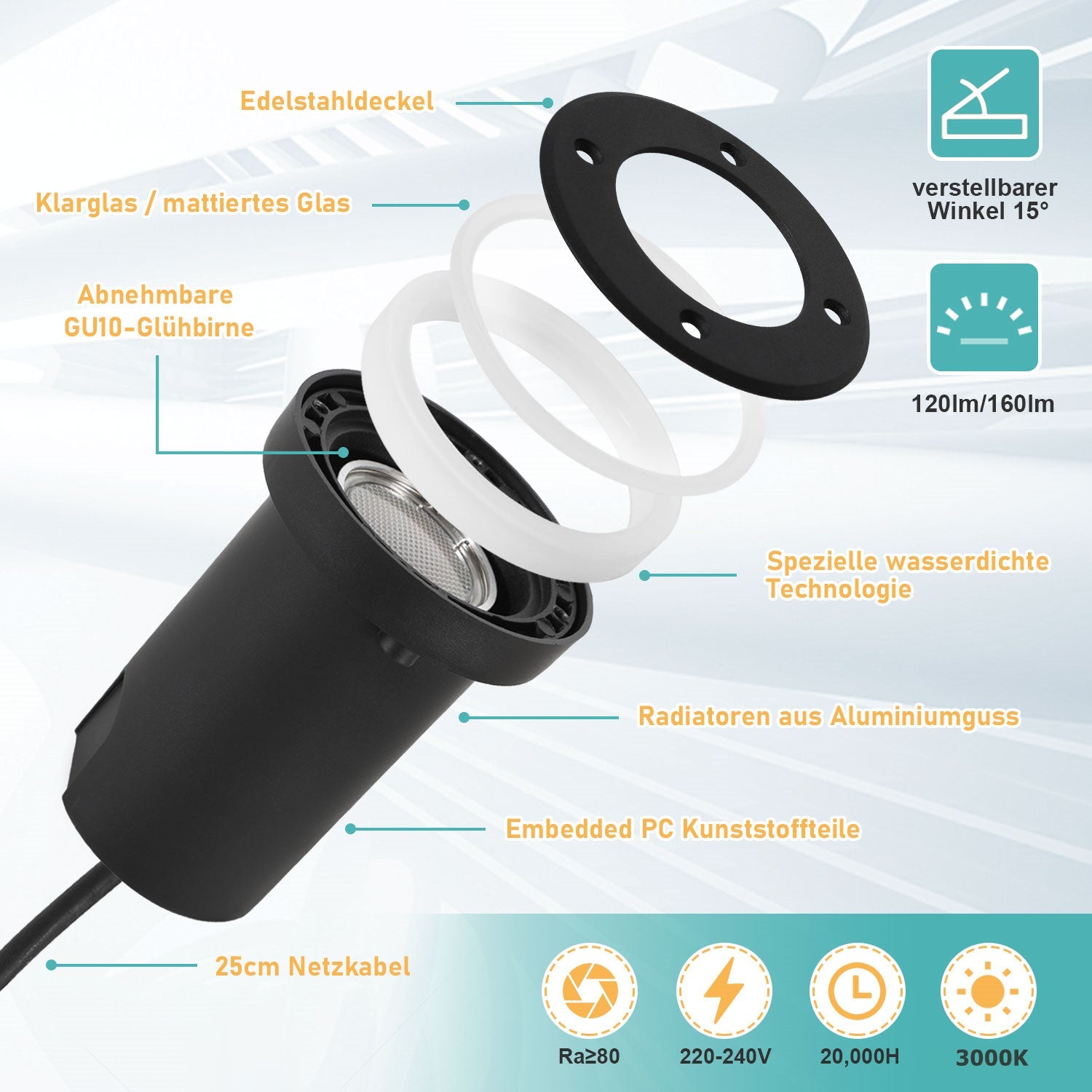 Vielseitige Anwendung: Diese GU10-Bodenspots eignen sich hervorragend zur Beleuchtung von Treppen, Terrassen, Rasenflächen, Gärten, Pools, Gebäudekanten oder Wegen. Für dekorative und funktionale Beleuchtung in verschiedenen Outdoor-Bereichen.