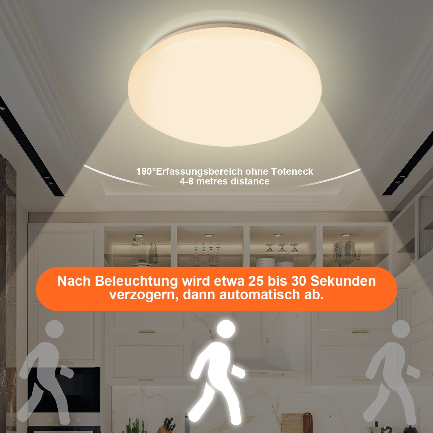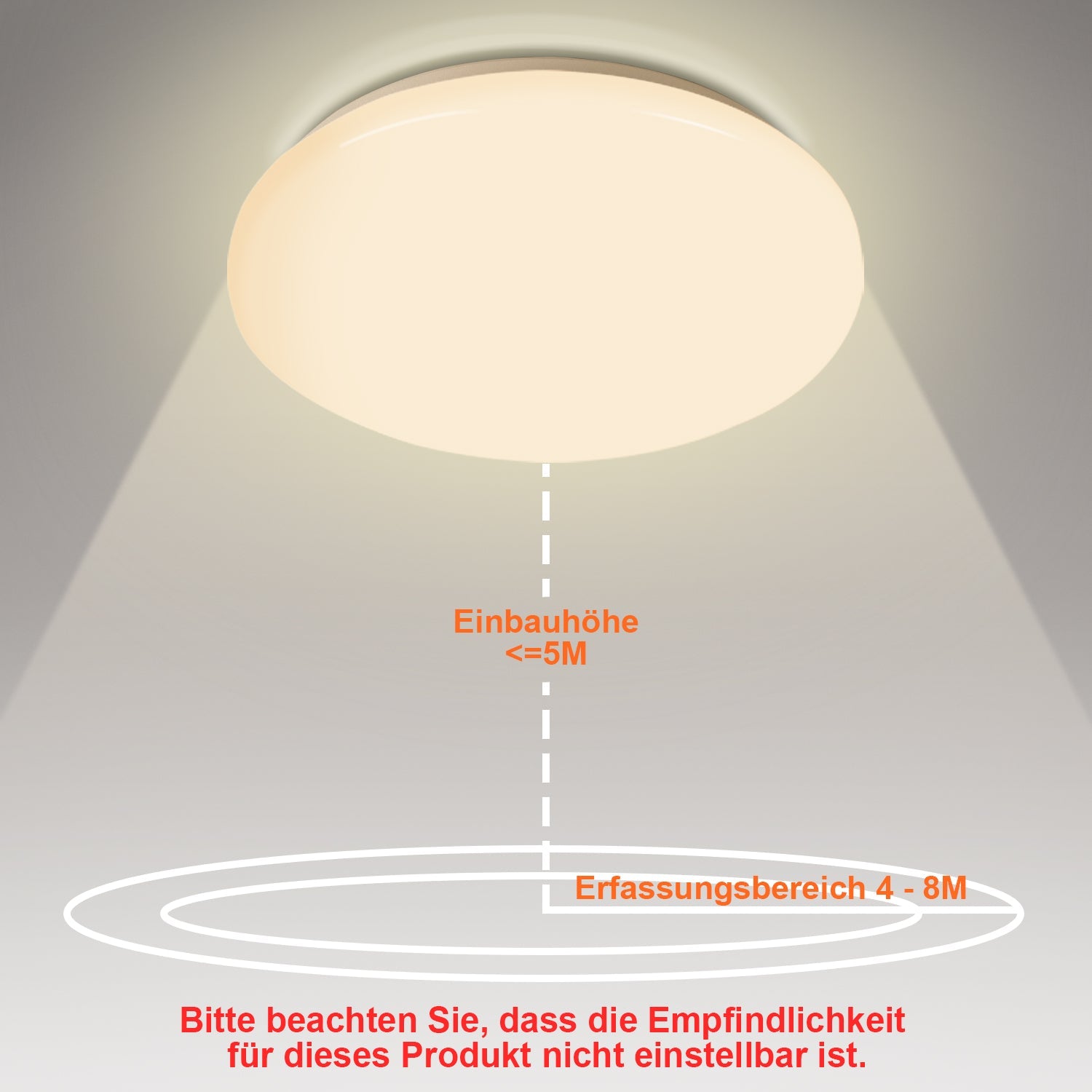 LED-Lampe mit Bewegungssensor: HF-Sensor (Mikrowellensensor), 5.8GHz CW Radar, Intelligenter 360° Hochfrequenz-Bewegungsmelder mit 4-8 m Reichweite. Die hochfrequenten Signale dringen auch durch Glas, Holz und Wände mit Leichtbauweise, d.h. das Licht ist automatisch aktiviert bevor Sie ganz vor der Tür stehen. (Die Empfindlichkeit ist nicht einstellbar).
