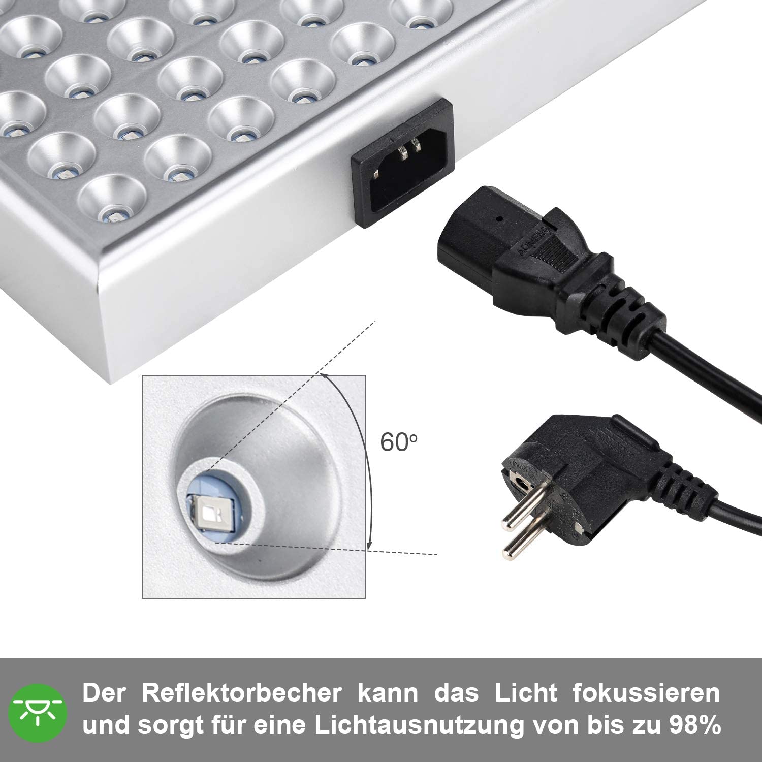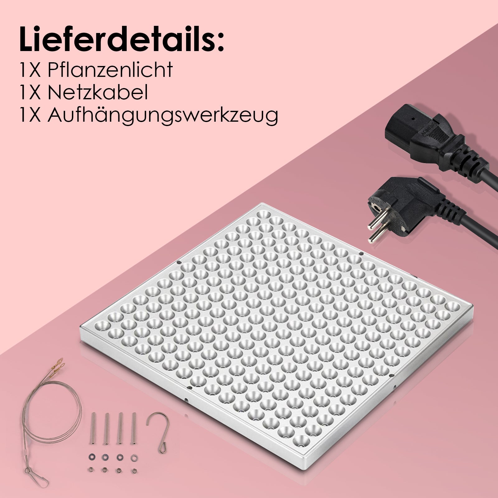 Spezifikationen: Größe des Pflanzenleuchte: 305 x 305 x 30 mm; Gewicht: 1,18 kg. Empfohlener Bestrahlungsabstand: 40cm - 100cm. Bestrahlungsreichweite: ca. 2㎡. Mit Netzstecker. Kabellänge ca. 120cm.