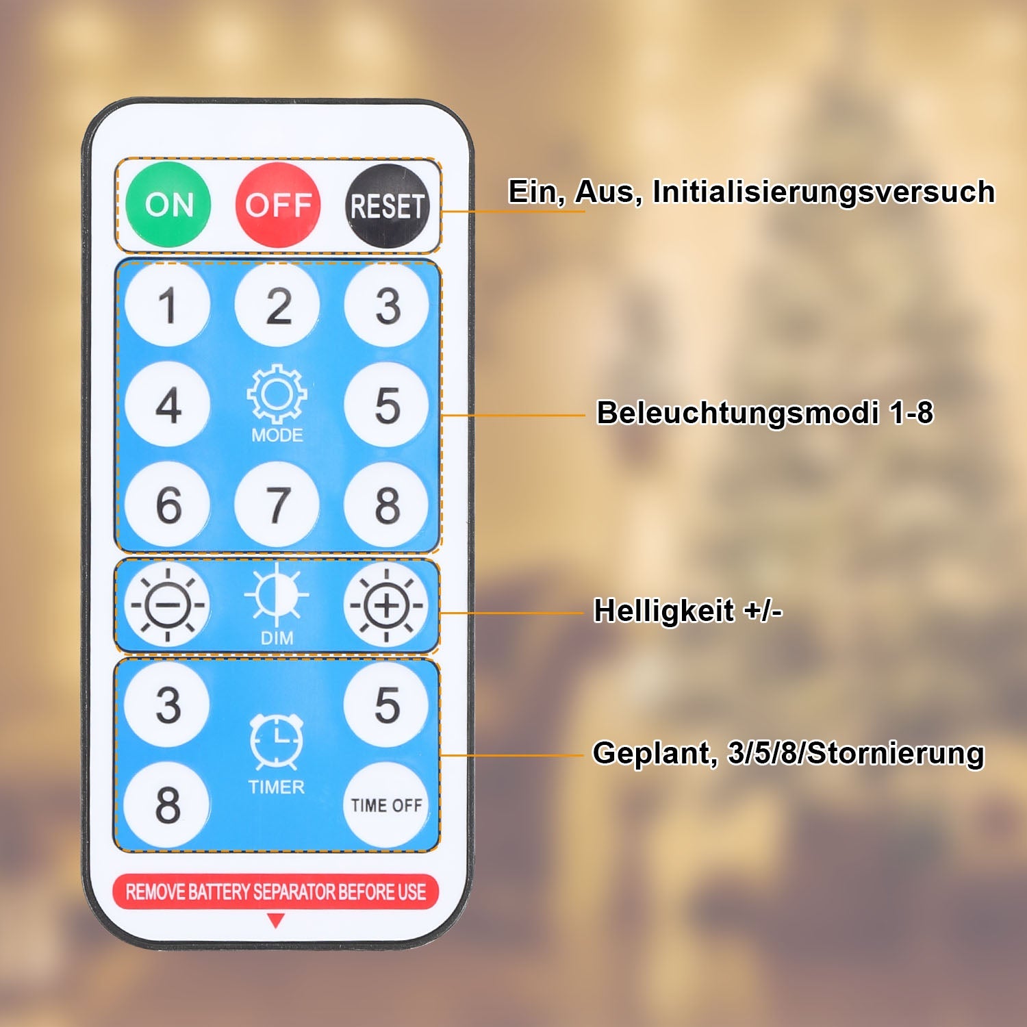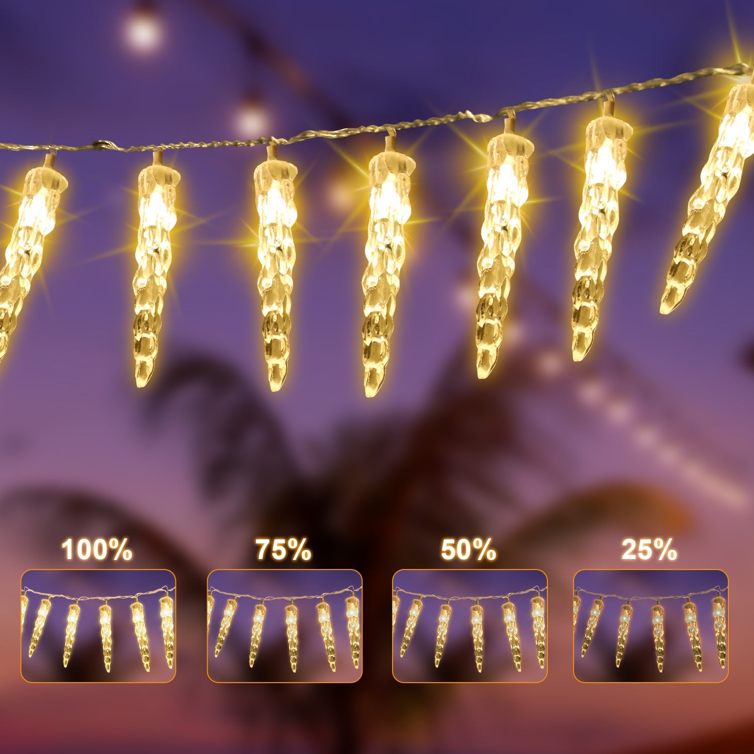 [Multifunktionales Eiszapfen-Feenlicht] Durch die Helligkeitsanpassung können vier Helligkeitsstufen von 25 % – 50 % – 75 % – 100 % erreicht werden, wobei die Timerfunktion drei Timerbereiche von 3/5/8 hat, während die Speicherfunktion es dem Eiszapfen-Feenlicht ermöglicht, die Einstellungen vor dem Ausschalten des Lichts vor einem Stromausfall zu speichern.
