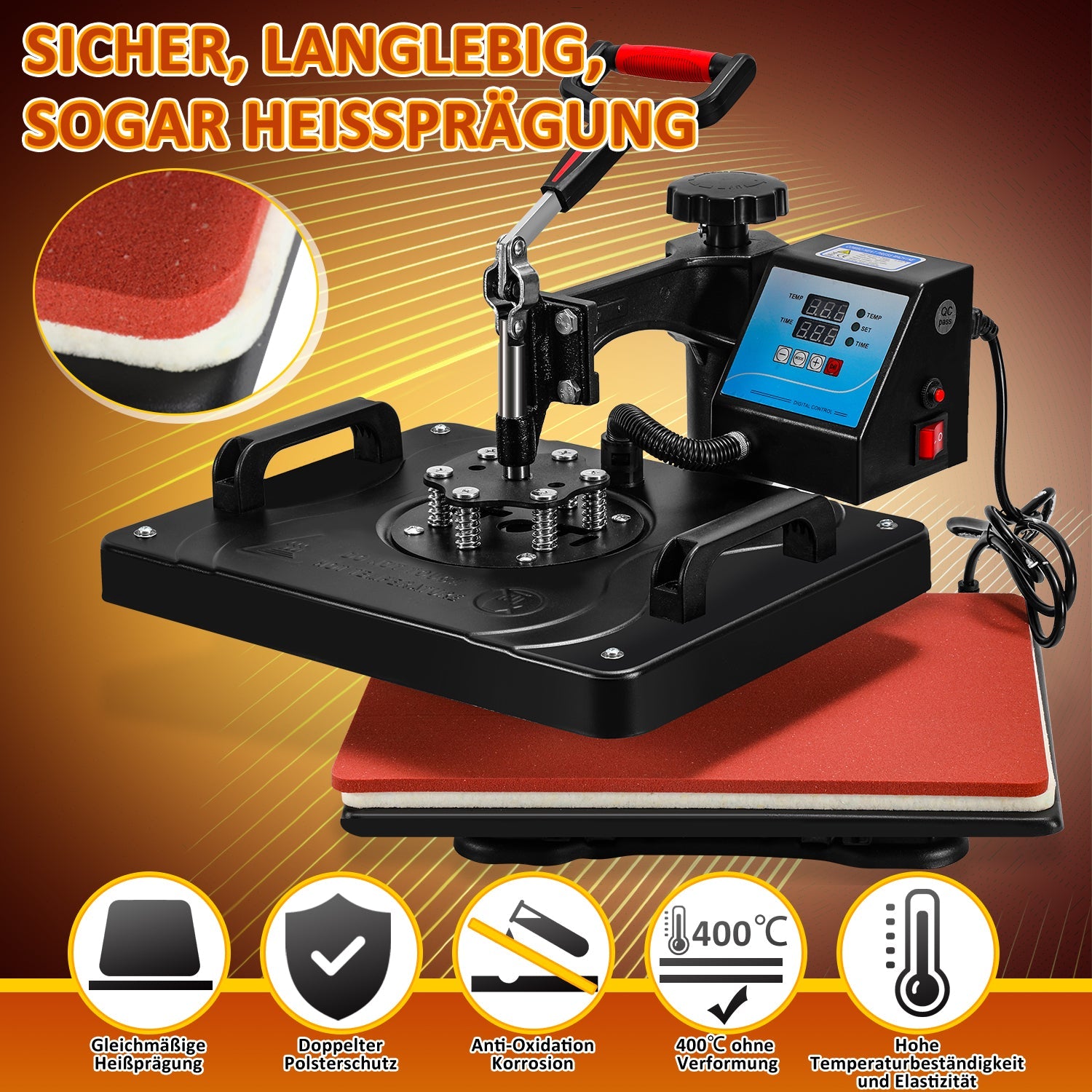 【Sichere, effiziente und gleichmäßige Wärmeübertragung】Die transferpresse ist aus hochwertigem, verdicktem Aluminiumblech gefertigt, das eine erhöhte Thermostabilität und Haltbarkeit sowie eine gleichmäßige Druckverteilung gewährleistet. transferpresse ist mit rutschfesten, arbeitssparenden, gummierten Griffen ausgestattet, die versehentliche Verbrennungen verhindern und einen sicheren, sorgenfreien Betrieb gewährleisten.