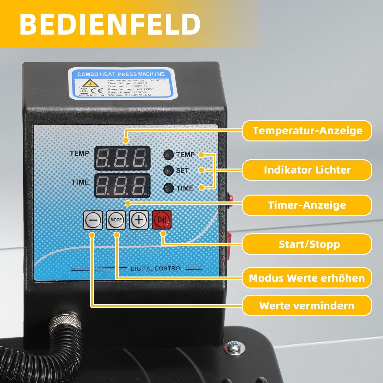 【Präzise digitale Steuerung】Das digitale LED-Kontrollgerät der Hitzepresse kann Zahlen und voreingestellte Temperaturen anzeigen und diese zeitlich steuern. Ein intelligenter akustischer Alarm warnt die Maschine, wenn die eingestellte Zeit und Temperatur erreicht ist. Die präzise Temperaturregelung gewährleistet, dass Ihre Designs lebendig, haltbar und langlebig sind.